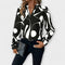 Esta blusa combina un estilo elegante y clásico con un toque moderno gracias a sus estampados geométricos negros sobre fondo beige. Su tejido ligero de poliéster es ideal para primavera, verano y otoño, mientras que su clásico drapeado en V y sus mangas anchas le dan un look versátil y elegante.