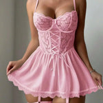 Selvya fue diseñada para mujeres que aman la sofisticación con un toque de seducción. Las copas bordadas, el sutil tirante tipo corsé y la falda transparente crean un equilibrio irresistible entre elegancia y deseo.