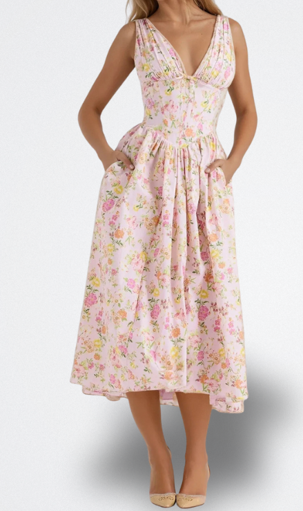Ponte el vestido Pilar y deja que su suave estampado floral te envuelva con elegancia. Con su pronunciado pico y cintura con muescas, es un cálido abrazo, ideal para un brunch al sol, un paseo junto al río o una escena romántica sin esfuerzo. Cada vuelta del vestido suspira una feminidad atemporal, haciéndote sentir radiante, segura y simplemente encantadora.