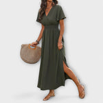El vestido Carmen combina materiales de alta calidad que ofrecen transpirabilidad y comodidad. Su elegante diseño con escote en V y corte entallado crea una silueta favorecedora que irradia sofisticación.