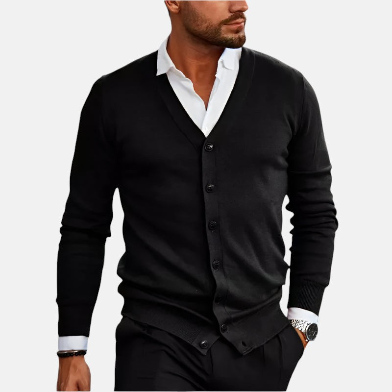 Este cárdigan de cuello en V para hombre ofrece una presencia sobria y distinguida. Su cierre de botones a lo largo del pliegue y los puños acanalados le confieren un acabado preciso, ideal para un estilo informal con un toque refinado.